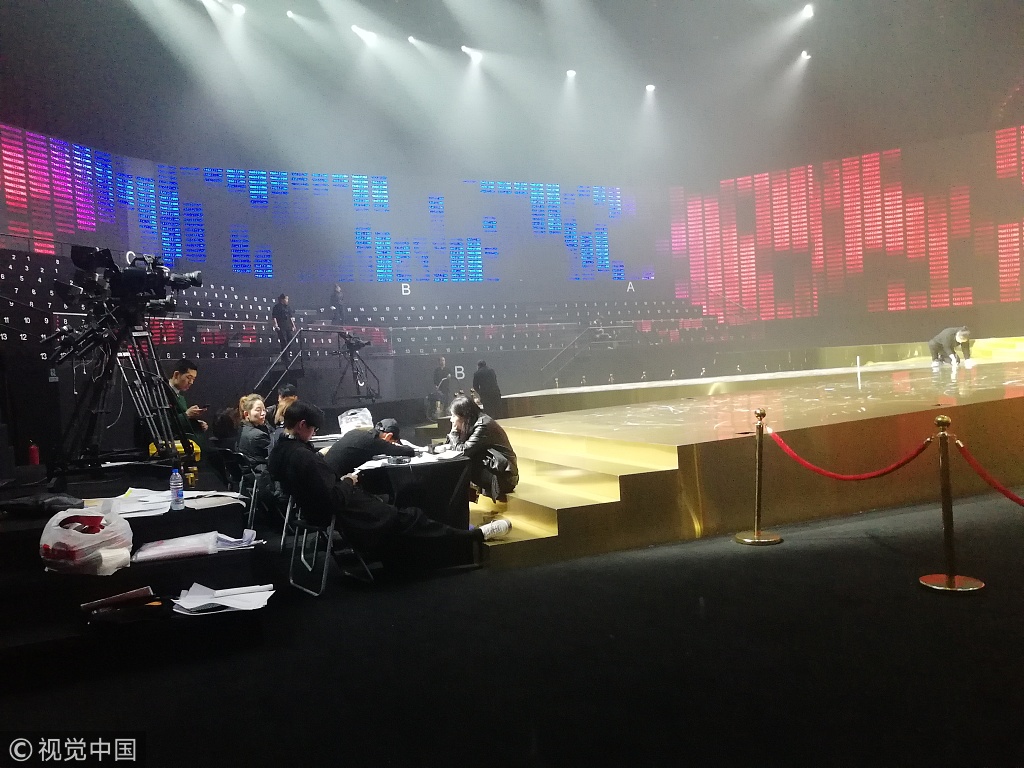 2018年11月21日,上海。Dolce&Gabbana The Great Sshow 杜嘉班纳上海2018时装秀正式取消!D&G官方解释此次事件是因为设计师和DG官方ins被盗。 图为宣布取消大秀后的现场,场内仅有零星几名模特和工作人员。(图源:视觉中国)