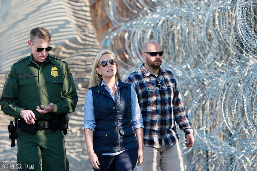 当地时间2018年11月20日,美国加利福尼亚州,美国土安全部部长尼尔森视察加固后的美墨边境墙。