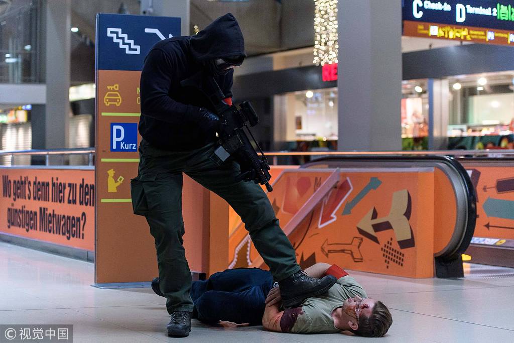 当地时间2018年11月20日,德国北莱茵-威斯特法伦州,科隆波恩机场上演反恐演习,据了解,这是迄今为止在德国机场举行的规模最大的反恐演习。