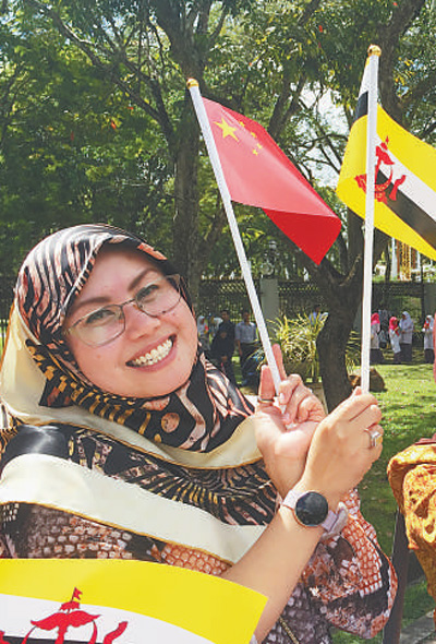 11月19日,文莱斯里巴加湾市,民众挥舞中文两国国旗,热烈欢迎习近平主席。 本报记者 王 芳摄