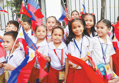 11月20日,菲律宾当地学生在总统府前挥舞两国国旗,热烈欢迎习近平主席。 本报记者 刘仲华摄