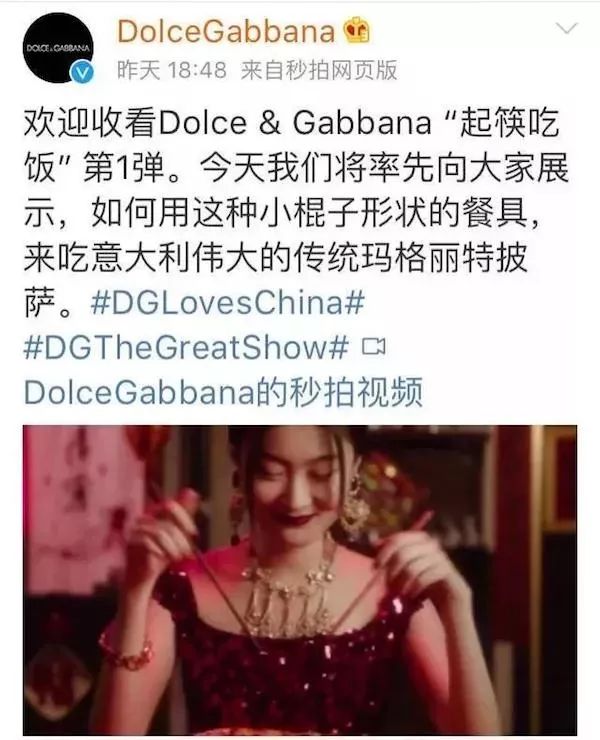 为了给此次大秀造势,D&G于11月17号在Ins和微博分别发布主题为“起筷吃饭”的宣传片,但从视频色调、内容、配音上看,这条预热视频引起部分网友关于品牌“辱华”的探讨,迫于舆论的压力,D&G官方微博24小时内删除了该条视频。
