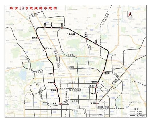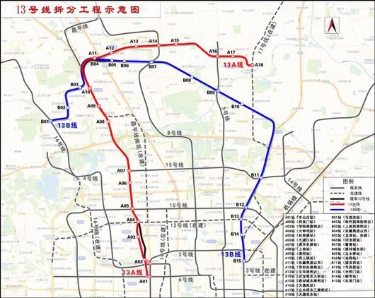 为改善回龙观天通苑地区出行条件、提高绿色出行比例,完善北部地区轨道交通线网,提出轨道交通13号线拆分方案。轨道交通13号线拆分工程在西二旗站至回龙观站间将既有13号线拆分,形成两条位于城市北部的交叉的“X”型线路:13A线和13B线(附图中的红线和蓝线。图中所示车站名称为工程名,最终以审定命名为准)。