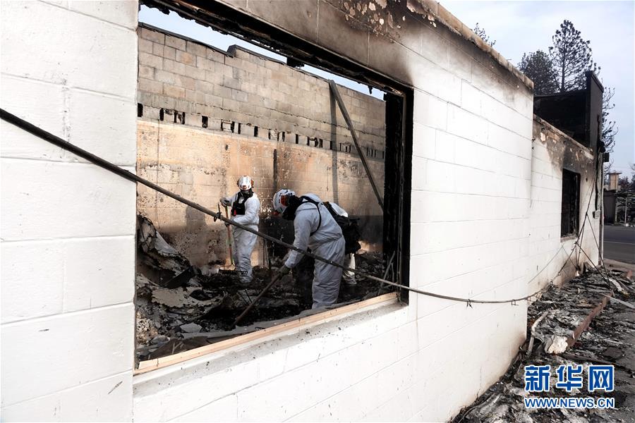 美国国家气象局预报,加州北部地区将很快迎来降雨。雨水将有助于缓解火情并改善空气质量,但对“坎普”灾区搜救工作和灾民安置工作会产生不利影响,并可能引发山洪和泥石流。11月20日,在美国加利福尼亚州比尤特县天堂镇,救援人员在山火废墟中工作。 新华社记者 吴晓凌 摄