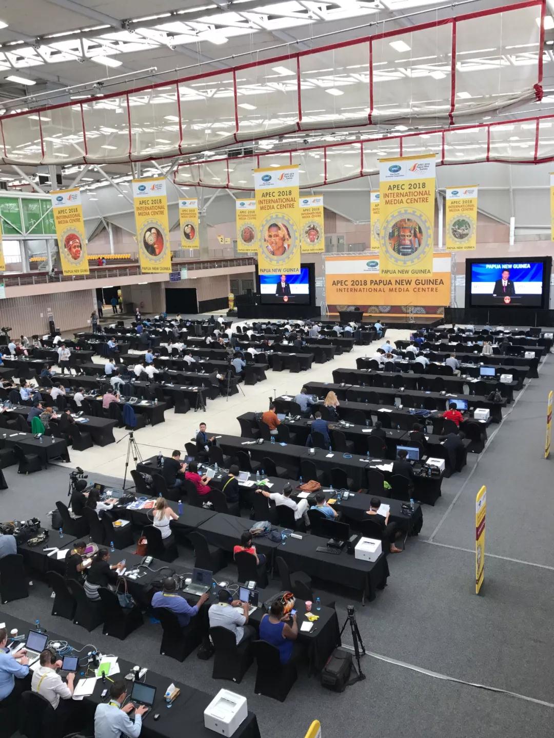 △各国媒体记者在APEC会议新闻中心关注习近平主旨演讲。(国广记者吕晓红拍摄)