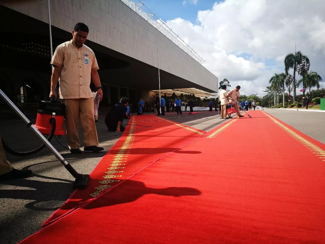 △文莱苏丹哈桑纳尔在王宫前广场为习近平举行了盛大的欢迎仪式。这是仪式开始前工作人员在清理红地毯。(央视记者周志国拍摄)