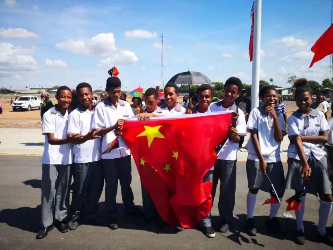 △独立大道上手持中国国旗的巴新男孩。(央视记者魏建拍摄)