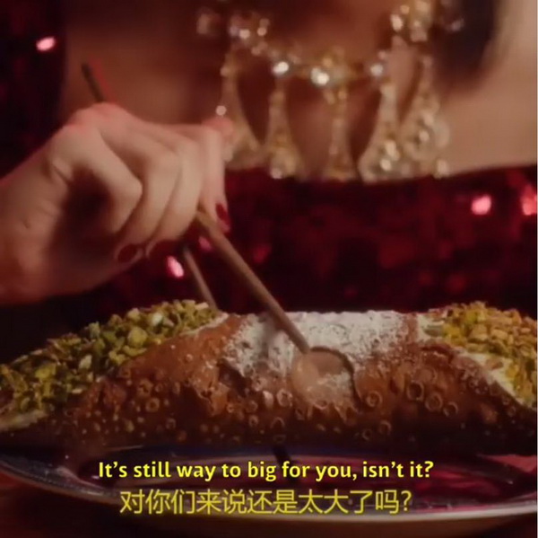 在杜嘉班纳的上海大秀预热短片中,一个单眼皮中国女孩坐在一家中餐厅里,笨拙地尝试用筷子品尝意大利传统美食——披萨、意大利甜卷和意大利面。而当她面对一个大号的甜卷、拿着筷子无从下手的时候,旁边是一个男声带有性暗示意味的提问:“这对你们来说还是太大了吗?”女孩儿全程带着莫名其妙的笑容。