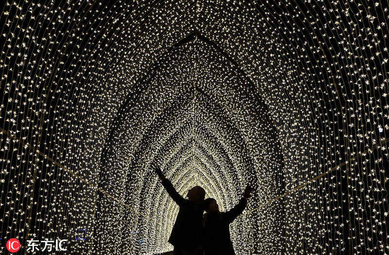 当地时间2018年11月21日,英国伦敦,英国皇家植物园邱园举行灯光秀,迎接圣诞季到来。超过一百万枚闪烁的灯光点亮植物园,沿着植物园的小径,有各种壮观的灯光和音响设置。游客们在光隧道中穿行,最后来到公园主要景点之一——棕榈屋,那里上演着更加精彩的激光束表演。据悉,英国皇家植物园(Royal Botanic Gardens)是世界上著名的植物园之一,包括建于18世纪位于伦敦西南部的泰晤士河南岸的邱园(Kew)和1965年扩建的位于苏沙斯(Sussex)的韦园(Wakehurst)两大部分,主园加卫星园共有360公顷。