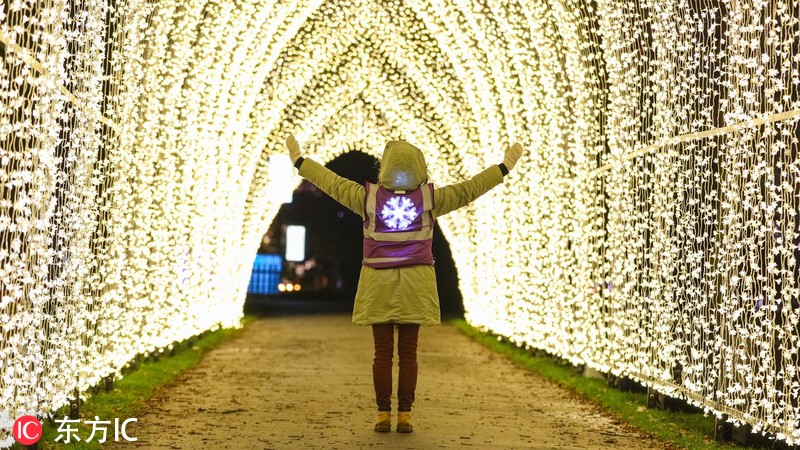 当地时间2018年11月21日,英国伦敦,英国皇家植物园邱园举行灯光秀,迎接圣诞季到来。超过一百万枚闪烁的灯光点亮植物园,沿着植物园的小径,有各种壮观的灯光和音响设置。游客们在光隧道中穿行,最后来到公园主要景点之一——棕榈屋,那里上演着更加精彩的激光束表演。据悉,英国皇家植物园(Royal Botanic Gardens)是世界上著名的植物园之一,包括建于18世纪位于伦敦西南部的泰晤士河南岸的邱园(Kew)和1965年扩建的位于苏沙斯(Sussex)的韦园(Wakehurst)两大部分,主园加卫星园共有360公顷。