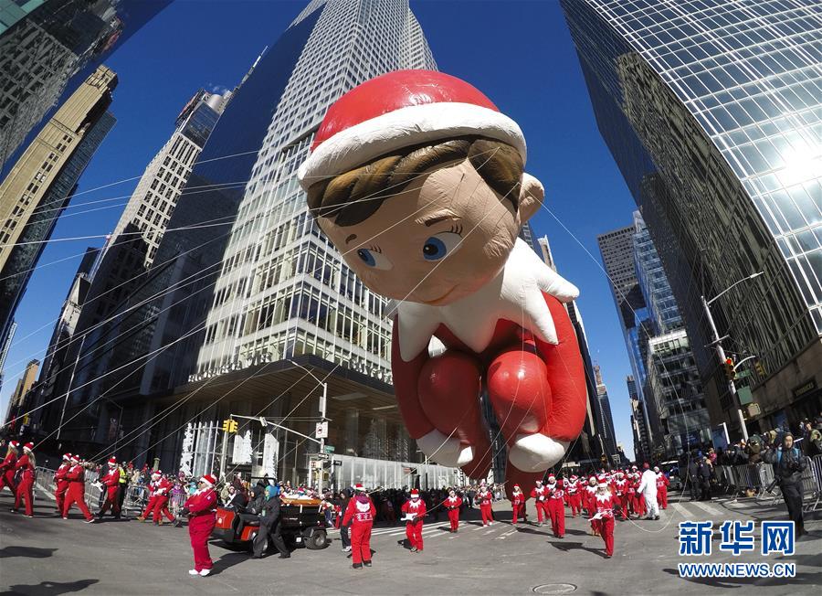 11月22日,在美国纽约感恩节大游行上,“书架精灵”造型气球行进在曼哈顿街头。新华社记者 王迎 摄