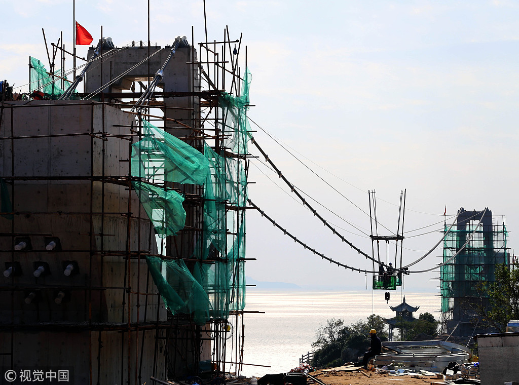 2018年11月22日,在浙江玉环市上栈头玻璃吊桥建设工程工地上,工人们正在吊篮中安装钢丝索夹,然后连接下垂吊杆,安装箱梁,铺置玻璃,抢抓时间准备元旦试运行。