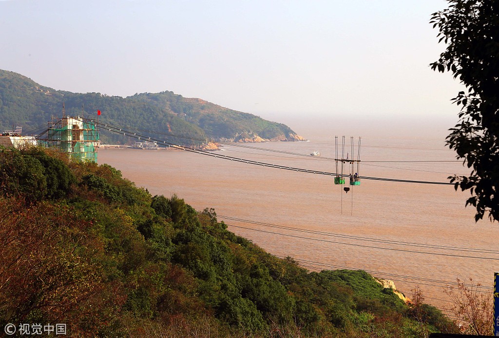 2018年11月22日,在浙江玉环市上栈头玻璃吊桥建设工程工地上,工人们正在吊篮中安装钢丝索夹,然后连接下垂吊杆,安装箱梁,铺置玻璃,抢抓时间准备元旦试运行。