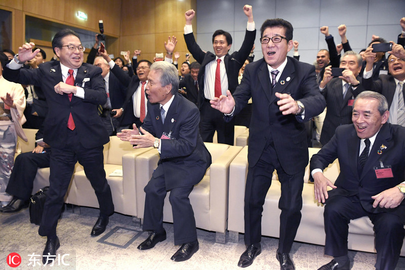 当地时间2018年11月23日,法国巴黎,国际展览局在巴黎宣布2025年世界博览会举办地票选结果,日本大阪当选,成功击败了俄罗斯和阿塞拜疆的城市。日本代表团得知结果后在现场欢呼庆祝。