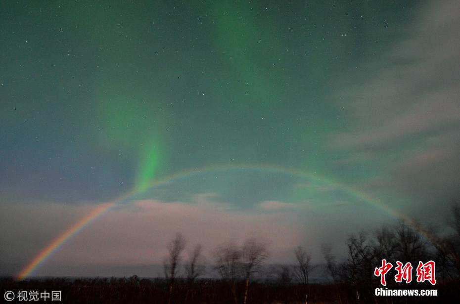 当地时间11月22日讯,瑞典阿比斯库国家公园,40岁的摄影师Chad Blakley拍摄到的罕见的月虹与极光同框画面。夜间虽然没有太阳,但如果有明亮的月光,大气中又有适当的云雨滴,便可形成月虹。