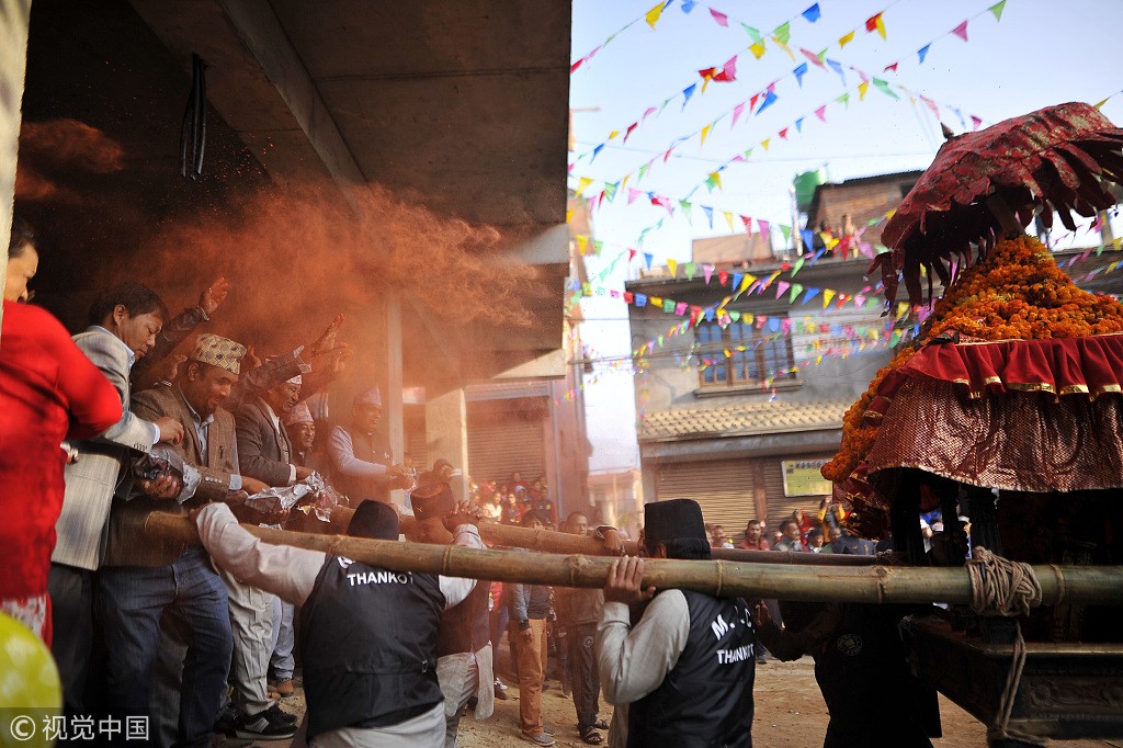 尼泊尔民众庆祝财富女神节 壮汉抬神龛狂奔