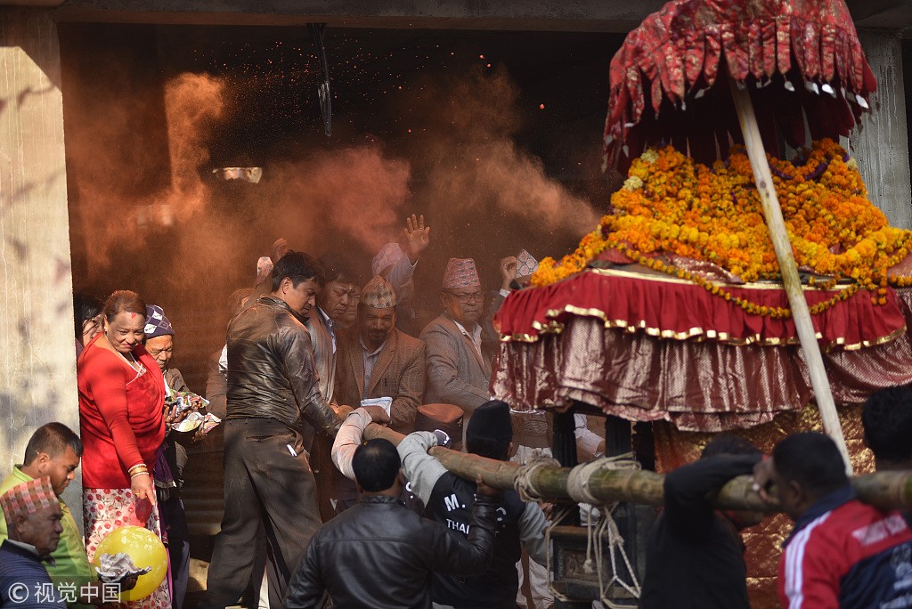 尼泊尔民众庆祝财富女神节 壮汉抬神龛狂奔
