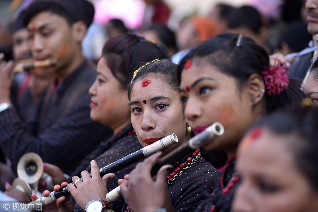 当地时间2018年11月24日,尼泊尔加德满都,民众庆祝财富女神玛哈拉克西米的节日。在传统的音乐和舞蹈的伴奏下,人们会向参加者和神龛上撒上朱红色的粉末。