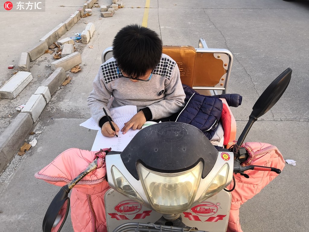 图为小学生在电动三轮车上写作业。(来源:东方IC)