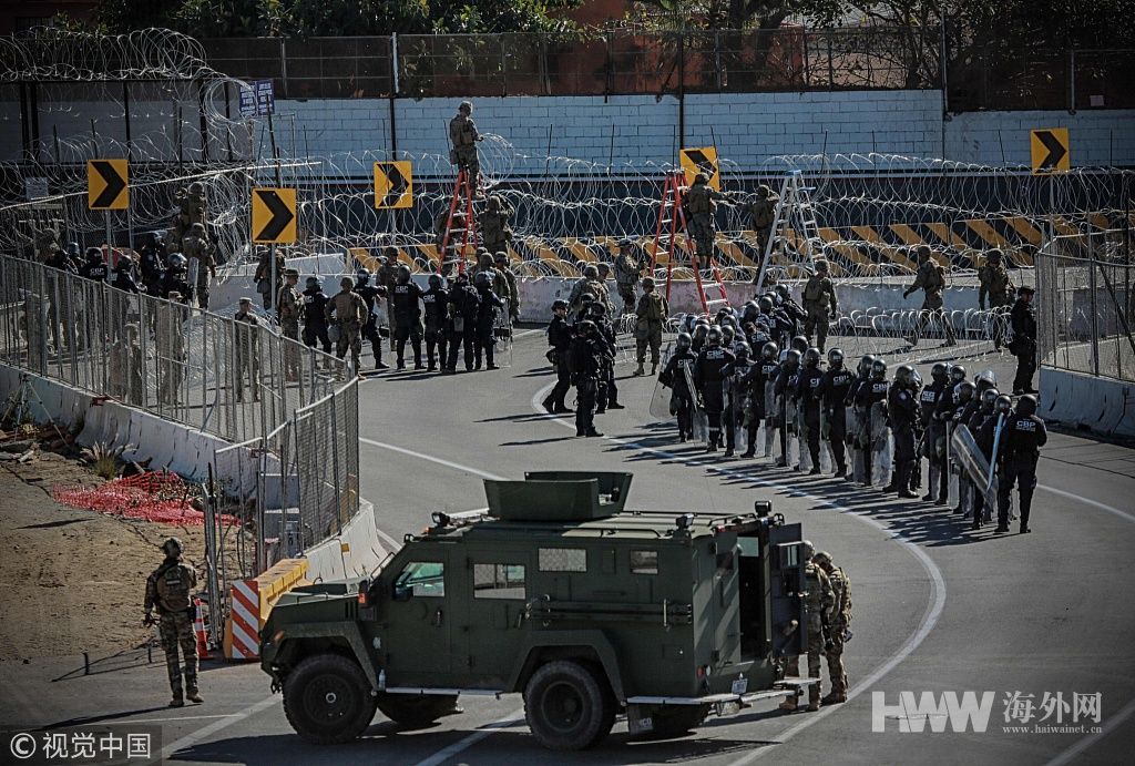 当地时间2018年11月25日,美国圣地亚哥,美国士兵在南部的圣思多罗过境处巡逻。当日,数百名中美洲移民试图冲破墨西哥提华纳与美国圣地亚哥间的一处口岸,进入美国申请庇护。美方封闭了此处入境口岸的双向道路和人行天桥。
