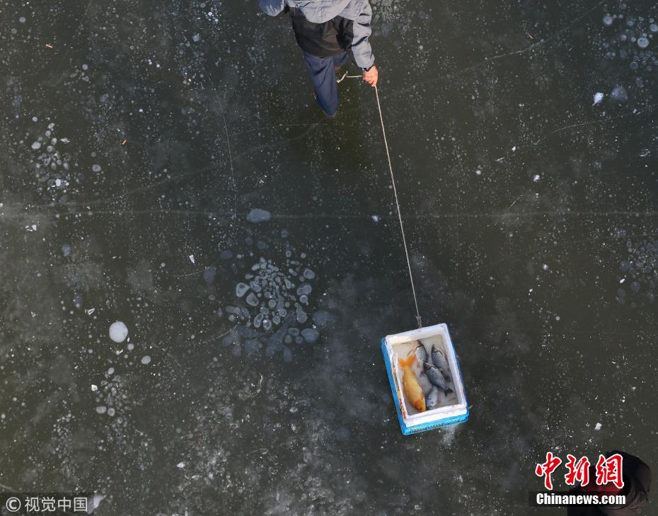 2018年11月25日,黑龙江省哈尔滨市,松花江封江不久,已经有人蹬江凿冰下网捕鱼。几片网,接连打出鲫鱼、鲤鱼,大大小小得有十多条。岸边,不少游客围观。