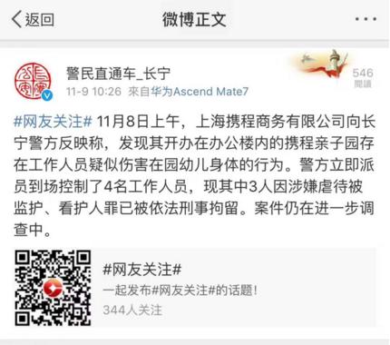 2017年11月8日上午,上海携程商务有限公司向长宁警方反映称,发现其开办在办公楼内的携程亲子园存在工作人员疑似伤害在园幼儿身体的行为。警方立即派员到场控制了4名工作人员,现其中3人因涉嫌虐待被监护、看护人罪已被依法刑事拘留。案件仍在进一步调查中。(央视记者 王殿甲)