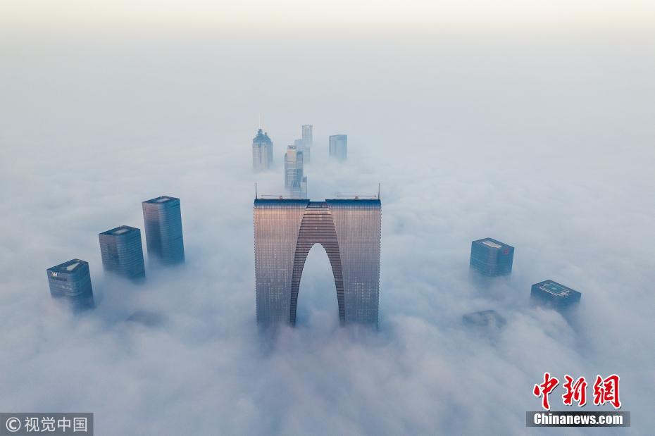 11月27日,江苏苏州,从500米高空看持续几天的大雾,一片云海之上仅有摩天大楼露出了面容。李浩军 摄 图片来源:视觉中国