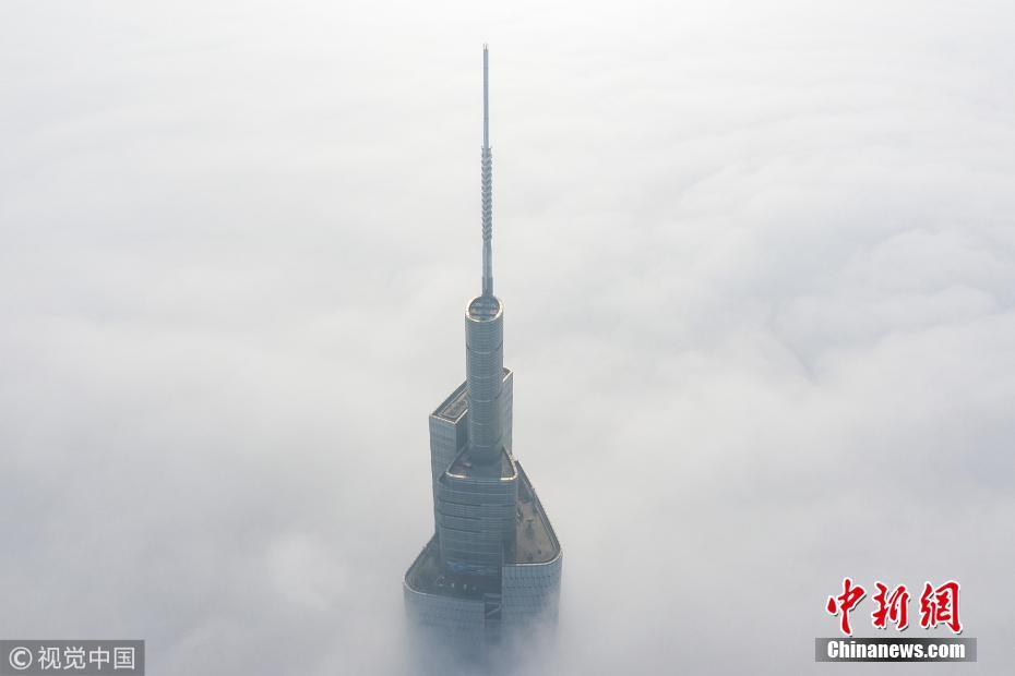 11月26日,南京出现大雾天气,当地气象台发布大雾红色预警信号,450米高的南京紫峰大厦在浓雾笼罩下鹤立“楼”群,恍若仙境。苏阳 摄 图片来源:视觉中国