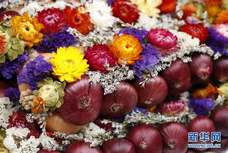11月26日,在瑞士首都伯尔尼的联邦国会大厦广场上,编好的洋葱在集市的摊位上等待顾客选购。  新华社发(鲁本·斯布里奇摄)