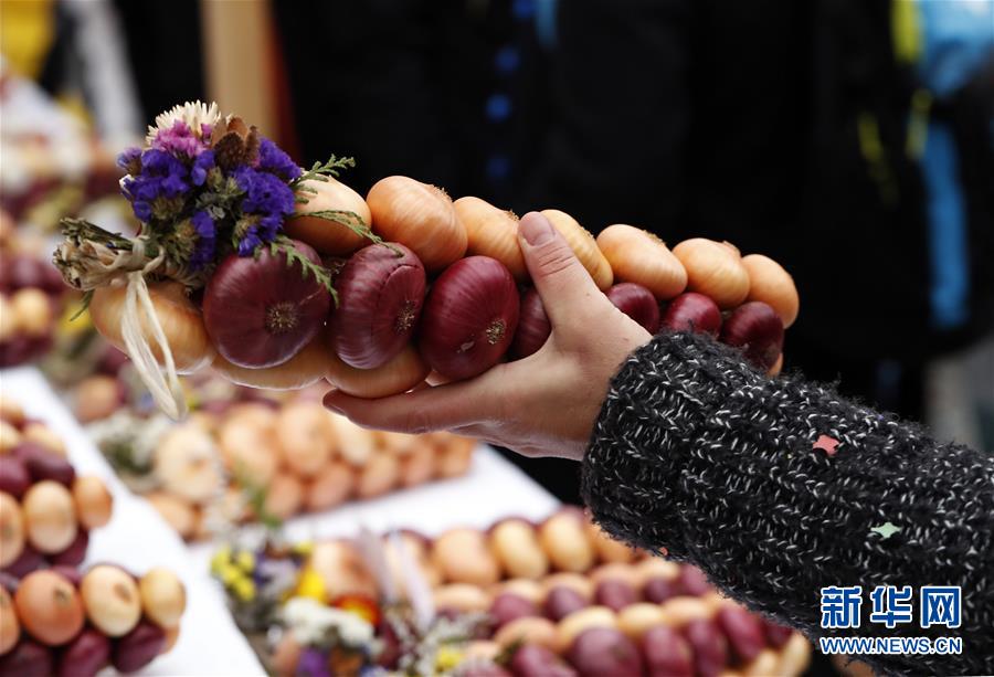 11月26日,在瑞士首都伯尔尼的联邦国会大厦广场上,一名女子在洋葱节集市的摊位上选购。  新华社发(鲁本·斯布里奇摄)