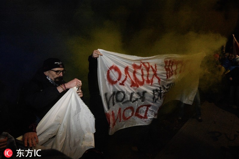 当地时间2018年11月26日,波兰华沙,示威者聚集在大使馆前,抗议乌克兰军舰遭俄罗斯扣押。 据媒体报道,三艘乌克兰海军船只于11月25日试图通过刻赤海峡从黑海进入亚速海,随后被俄方扣留,有人员受伤。