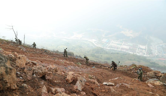 3年来,共扫除雷区近60平方公里,人工搜排地雷等爆炸物近20万枚(发)。图为云南扫雷大队官兵利用安全绳保护在某界碑雷场作业。