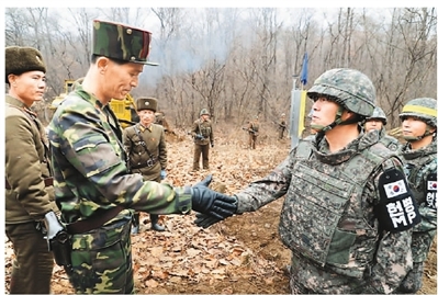 图为日前参与公路修建工作的朝韩军人在军事分界线附近握手致意。