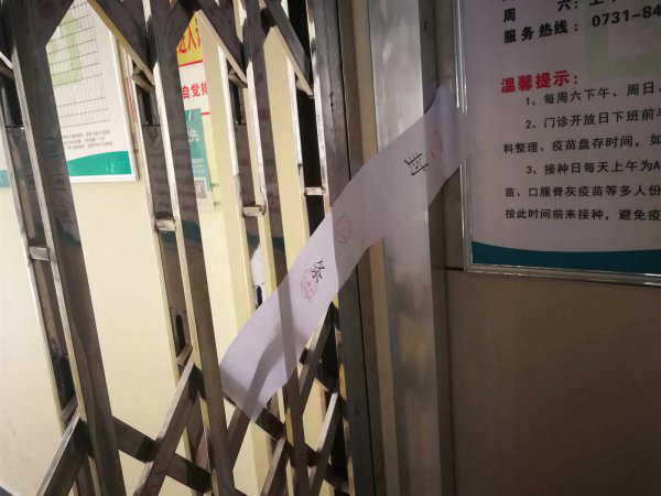 据记者了解,接种疫苗的地点在住院大楼对面的门诊大楼三楼。记者前往时看到,接种疫苗的接种登记室和旁边一间办公室均已经被辖区的开福公安分局洪山桥派出所贴上了封条,一些带着孩子前往此处接种疫苗的市民被引导前往附近的疫苗接种点。