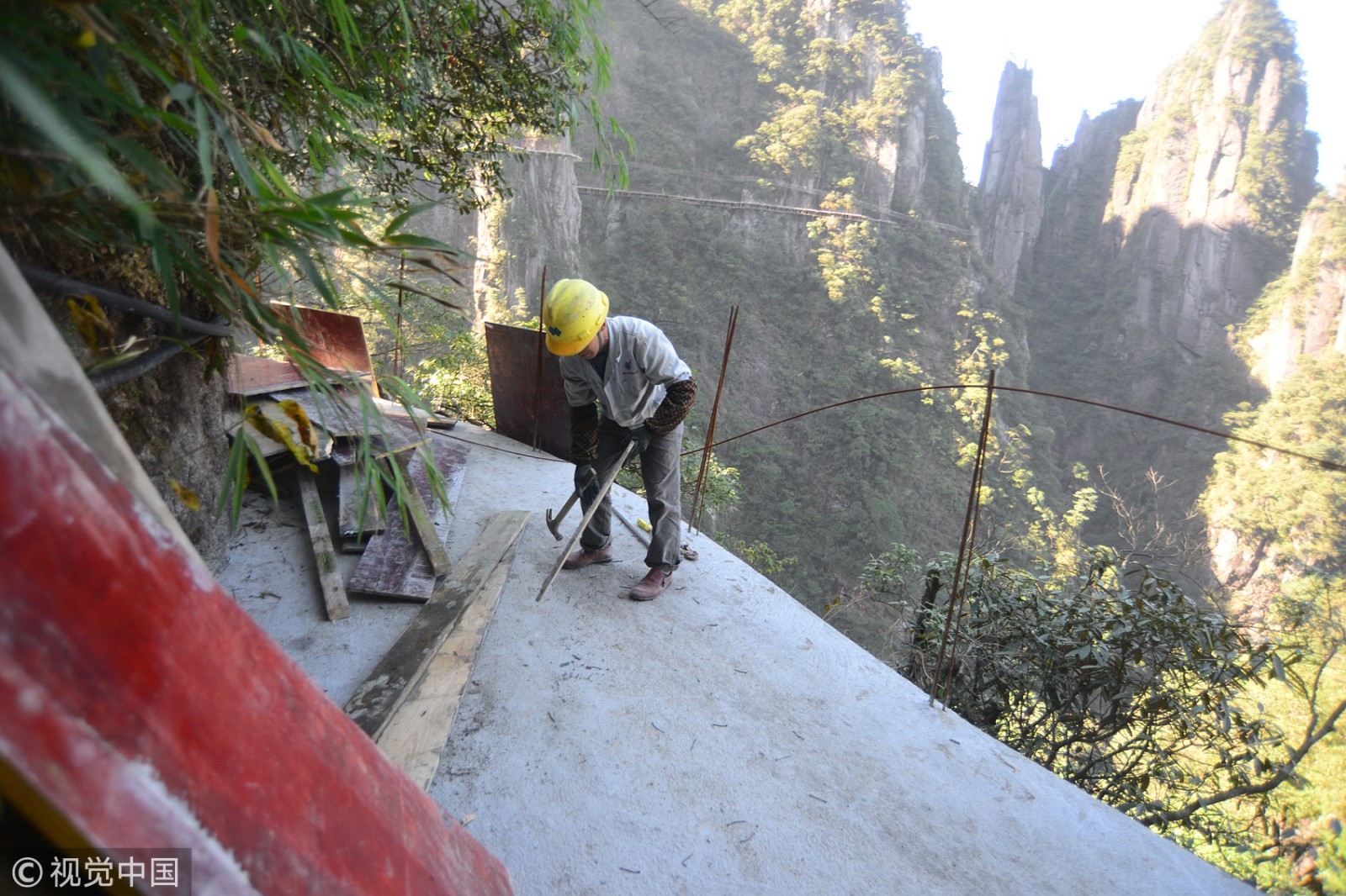 据了解,莽山悬空栈道工程达8公里,听起来不算长,但需要克服的困难却不少。由于地理位置特殊,山路只能通到天台山下的停车场,距工程现场还有近400米的石阶路,运输水泥、沙子的车辆无法抵达。为了修建栈道,施工方在不通电、不通水的情况下,想方设法引水通电。工程所需的水泥、沙子,都是工人们依靠货索一桶一桶往上运输。