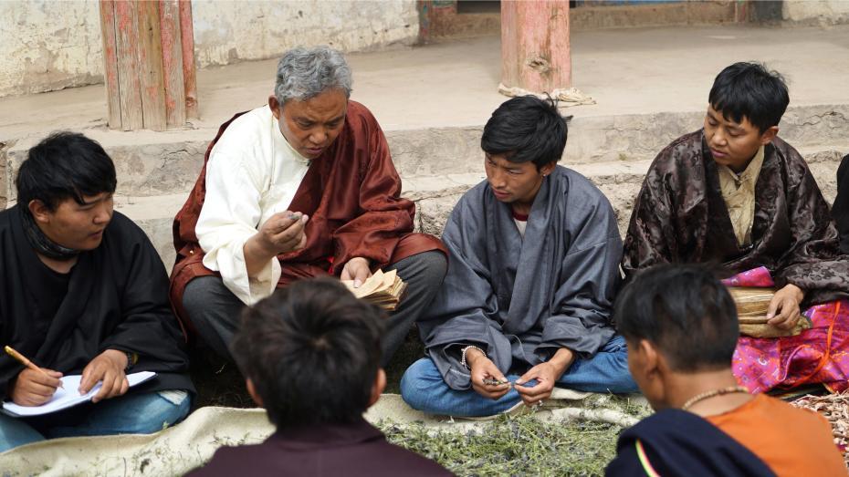 其木居曼巴(世袭家族医生)丹松扎巴(左二)为学生讲授辨认药浴药材的方法。刘罡 摄 中国非物质文化遗产保护中心供图