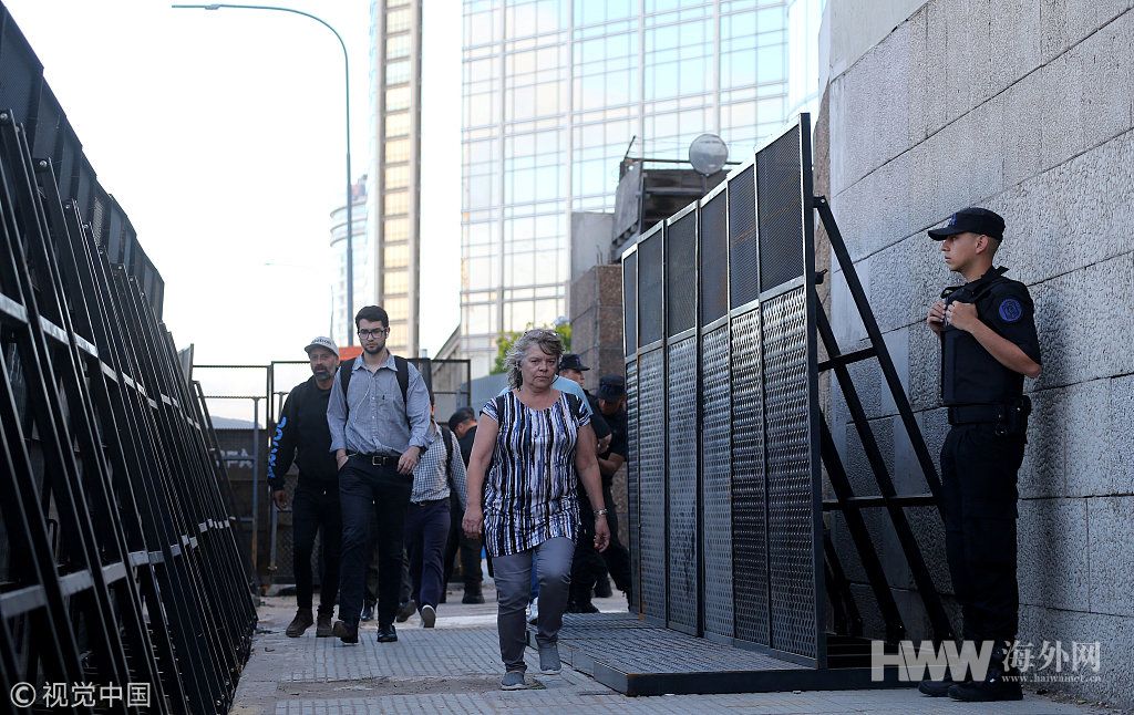 民众从布宜诺斯艾利斯“七九大道”安装的铁栅栏胖走过。