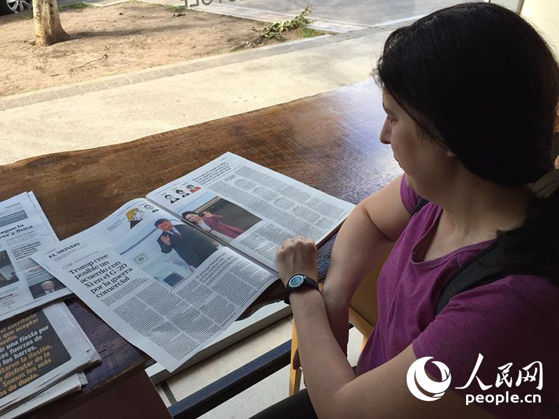 阿根廷当地居民正在阅读有关中国的报道。赵铎摄影