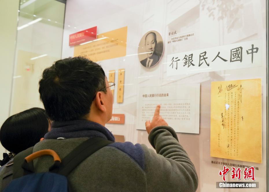 11月30日,“中国名片——人民币发行70周年纪念展”在北京中国国家博物馆开幕。展览共分十大板块,展出珍贵展品500余件,涵盖中华人民共和国发行的五套人民币、普通纪念币、纪念钞、贵金属纪念币,以及打击防范假币等方面的知识介绍。图为观众观看中国人民银行早期成立和发展的史料展览。中新社记者 贾天勇 摄