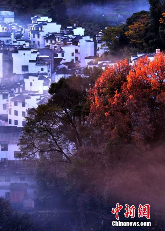 11月29日,冬日的江西省婺源县江湾镇晓鳙古村“枫”景如画。清晨山岚渐起,柴火炊烟袅袅,第一缕阳光照射村落,洒在村口几十数棵百年香枫上,可谓“枫”景怡人。曹加祥 摄