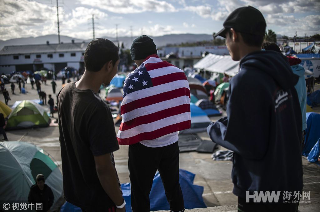 移民滞留美墨边境 身披美国旗渴望入境