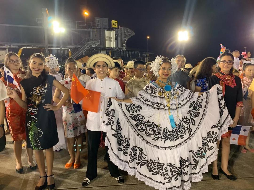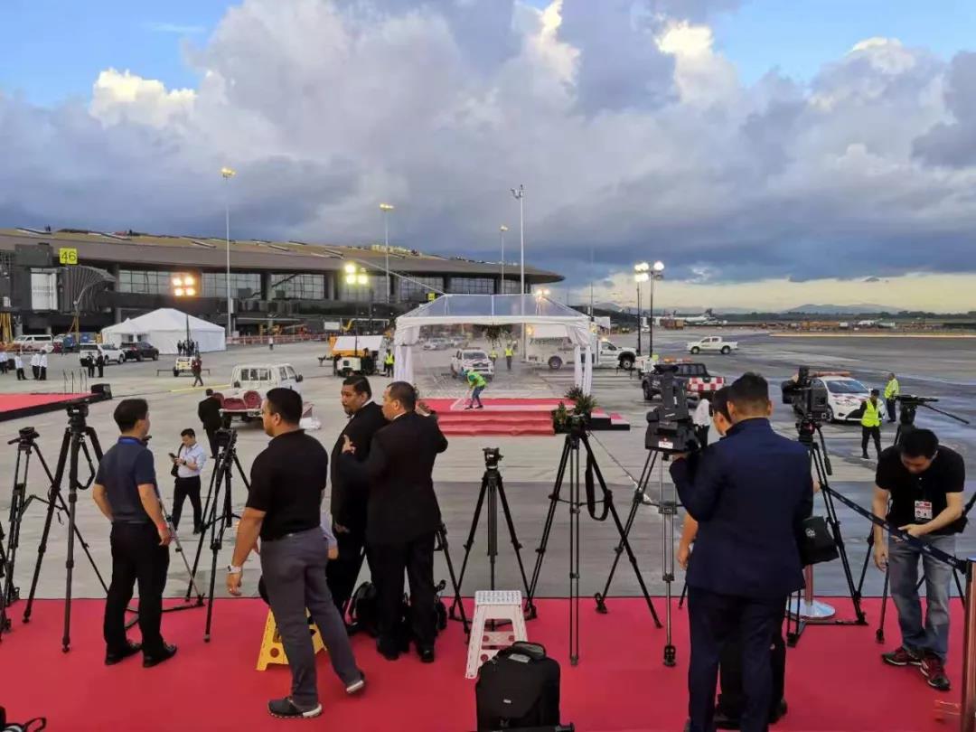 △巴拿马总统巴雷拉夫妇亲自到机场迎接习近平主席夫妇。远处是可遮雨的检阅台。(央视记者关舟拍摄)