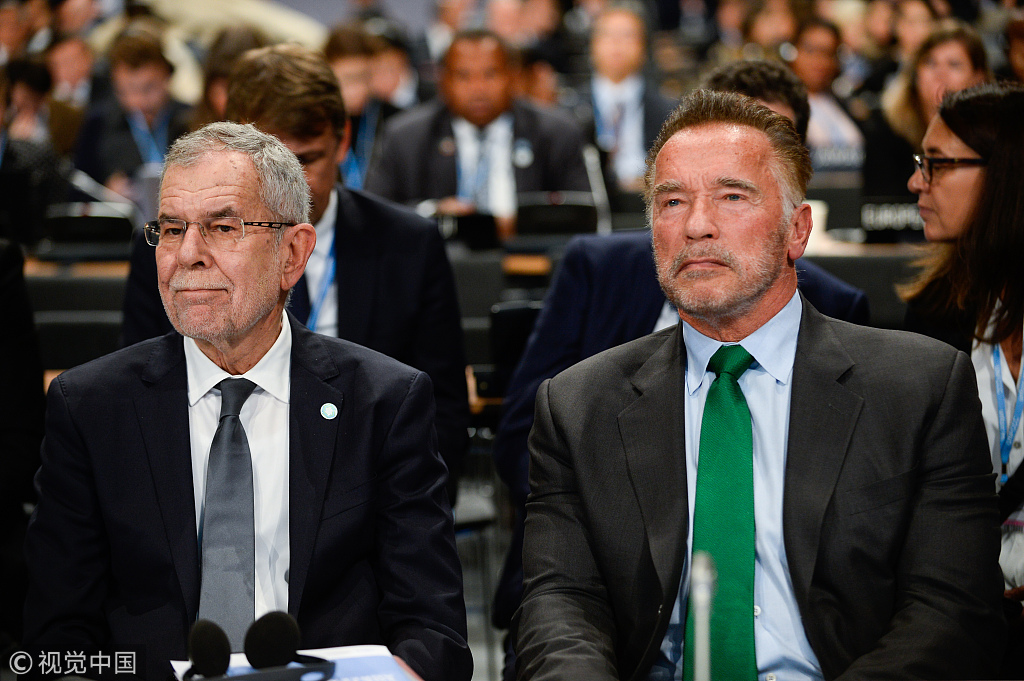 当地时间2018年12月3日,波兰卡托维兹,好莱坞影星和前加州州长阿诺德·施瓦辛格出席第二十四届联合国气候变化大会,发表演讲。