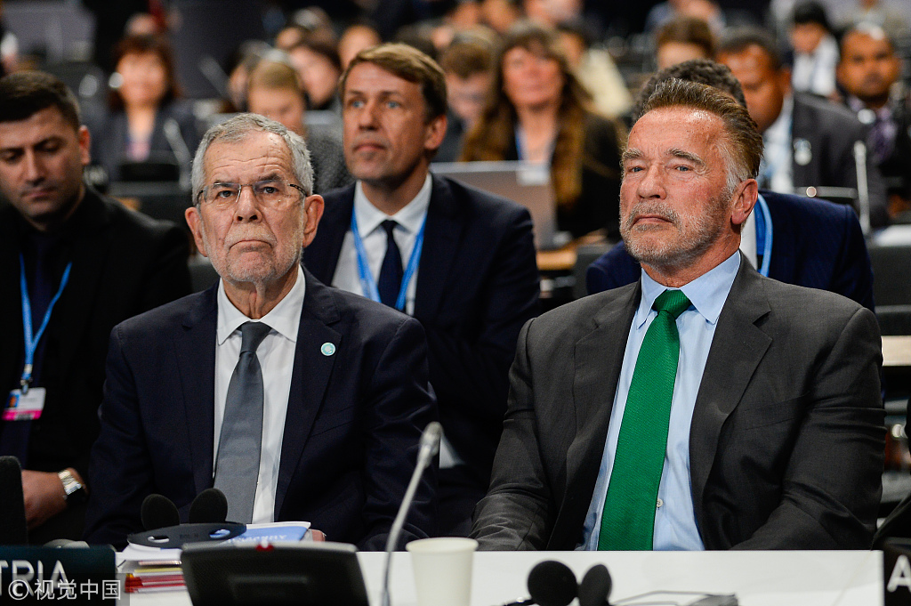 当地时间2018年12月3日,波兰卡托维兹,好莱坞影星和前加州州长阿诺德·施瓦辛格出席第二十四届联合国气候变化大会,发表演讲。