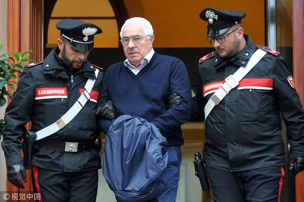 当地时间2018年12月4日,意大利西西里首府巴勒莫,西西里黑手党的新头目、珠宝商Settimino Mineo被捕,被押送离开警察局。意大利西西里岛警方日前在一次重大突袭中逮捕了黑手党新头目Settimino Mineo和其他几十名嫌疑人。