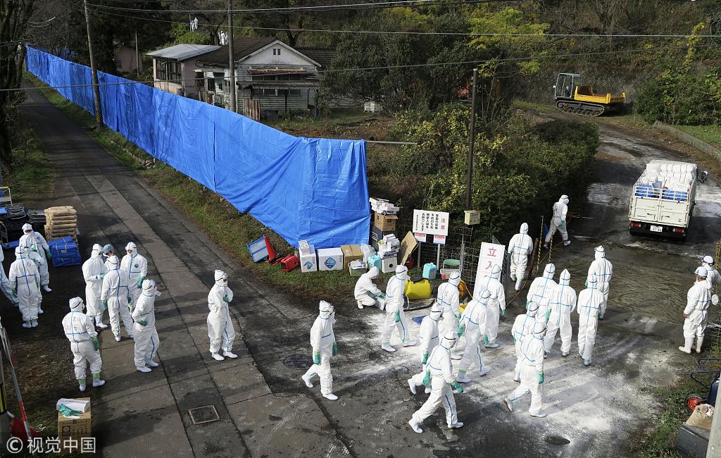 当地时间2018年12月5日,日本岐阜县美浓加茂,防疫工作展开。当天早些时候,当地研究所发现了猪瘟病毒。
