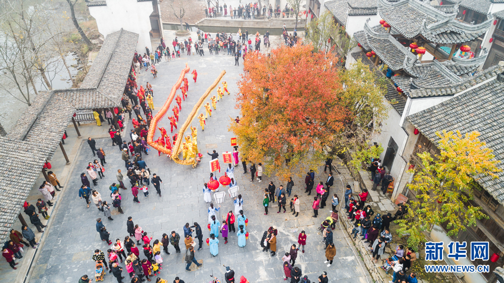 当日,安徽省铜陵市义安区明塘文化艺术村民俗文化展演活动上,舞龙、舞狮、迎亲、划旱船等独具特色的民俗文化盛宴,吸引了众多游客前来观看。新华网发(陈磊 摄)