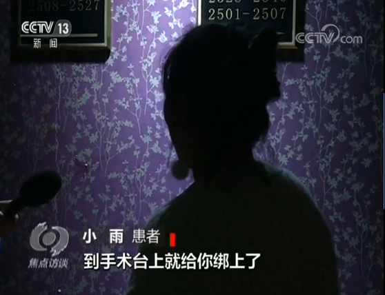 小雨说:“到手术台上就给你绑上了,好多人,而且特别疼,我就没有办法了。跟我说四千八百多的必须得做了,不做怎么怎么样。那个时候特别无助,相当于给你绑在了手术台上,不做也得做,然后就麻药上了,就做了。”