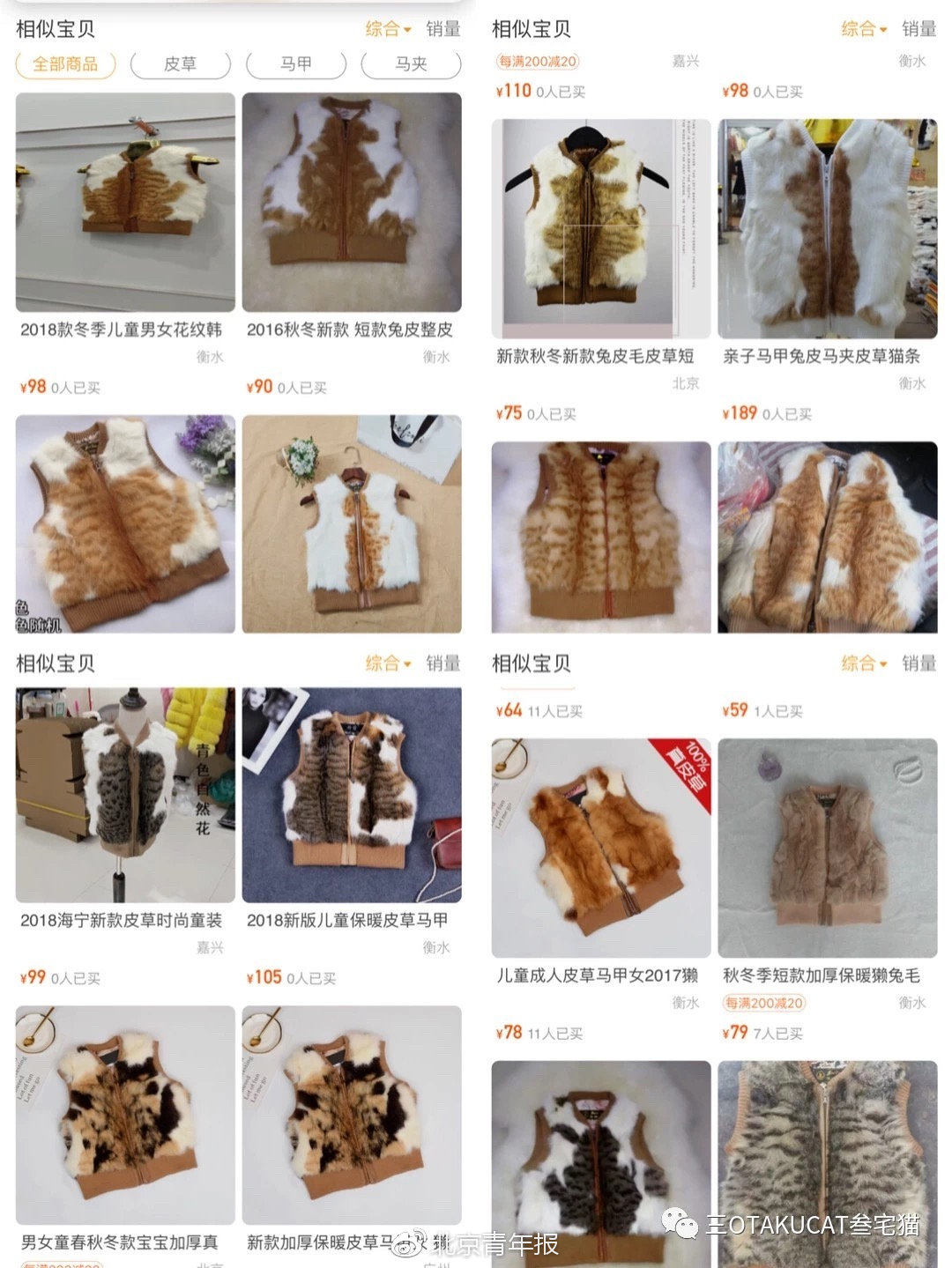 网帖中贴出的杭州某店铺卖家告诉北青报记者,商品是兔毛皮草,共有五个花色。随后,北青报记者发现,该商品显示“商品过期不存在”,且该平台上其他的“猫皮马甲”也已下架。“没货了,皮色不一定。”卖家回复北青报记者。