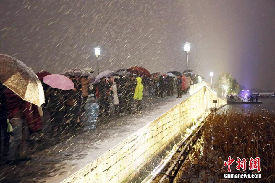 12月8日,杭州普遍降雪,众多游客前往断桥上拍摄雪景。当晚,杭州市气象台发布暴雪蓝色预警信号。中新社记者 毛建军 摄